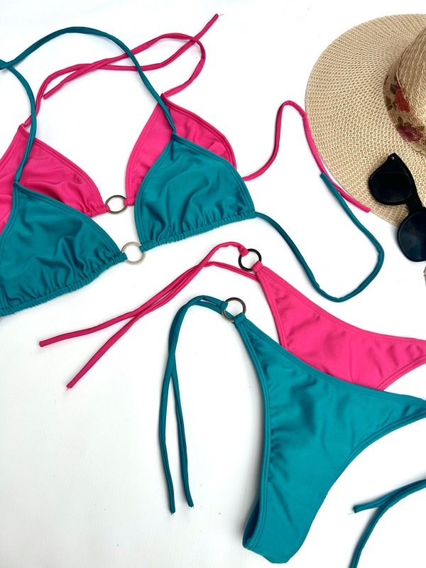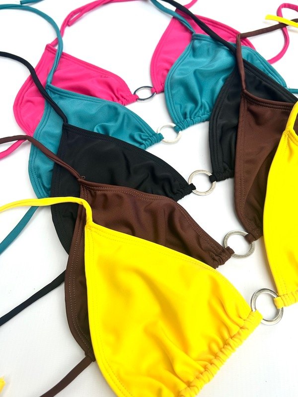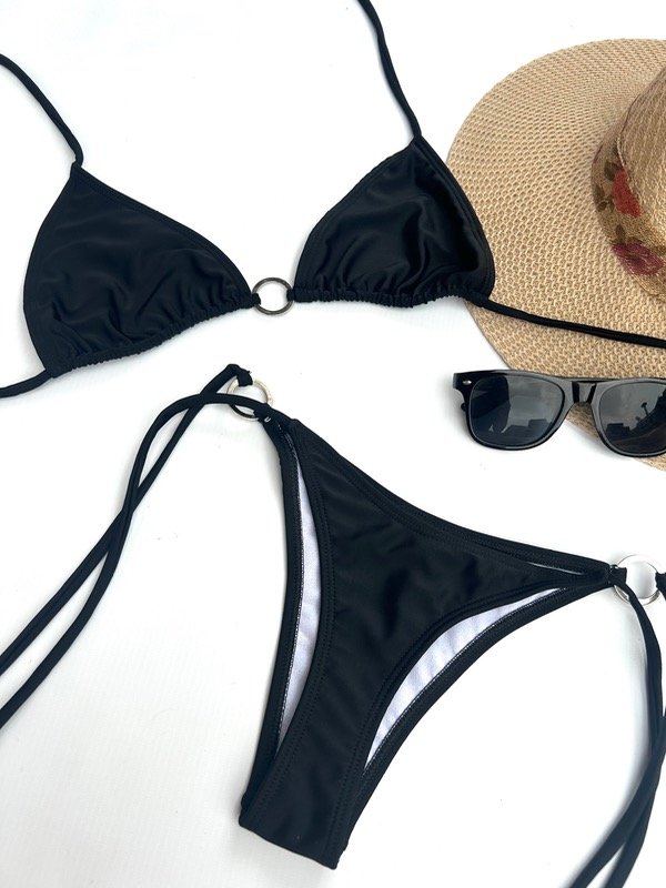 Bikini lisa. Corpiño con breteles para atar en hombros y espalda. Detalle de arandela en el centro.