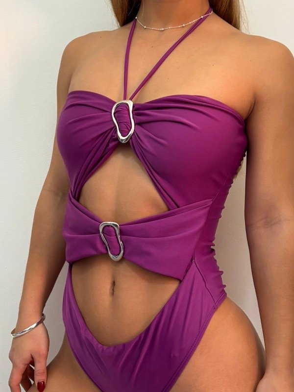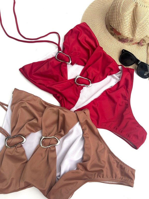 Enteriza importada con detalles de arandelas irregulares. Breteles para atar en cuello.